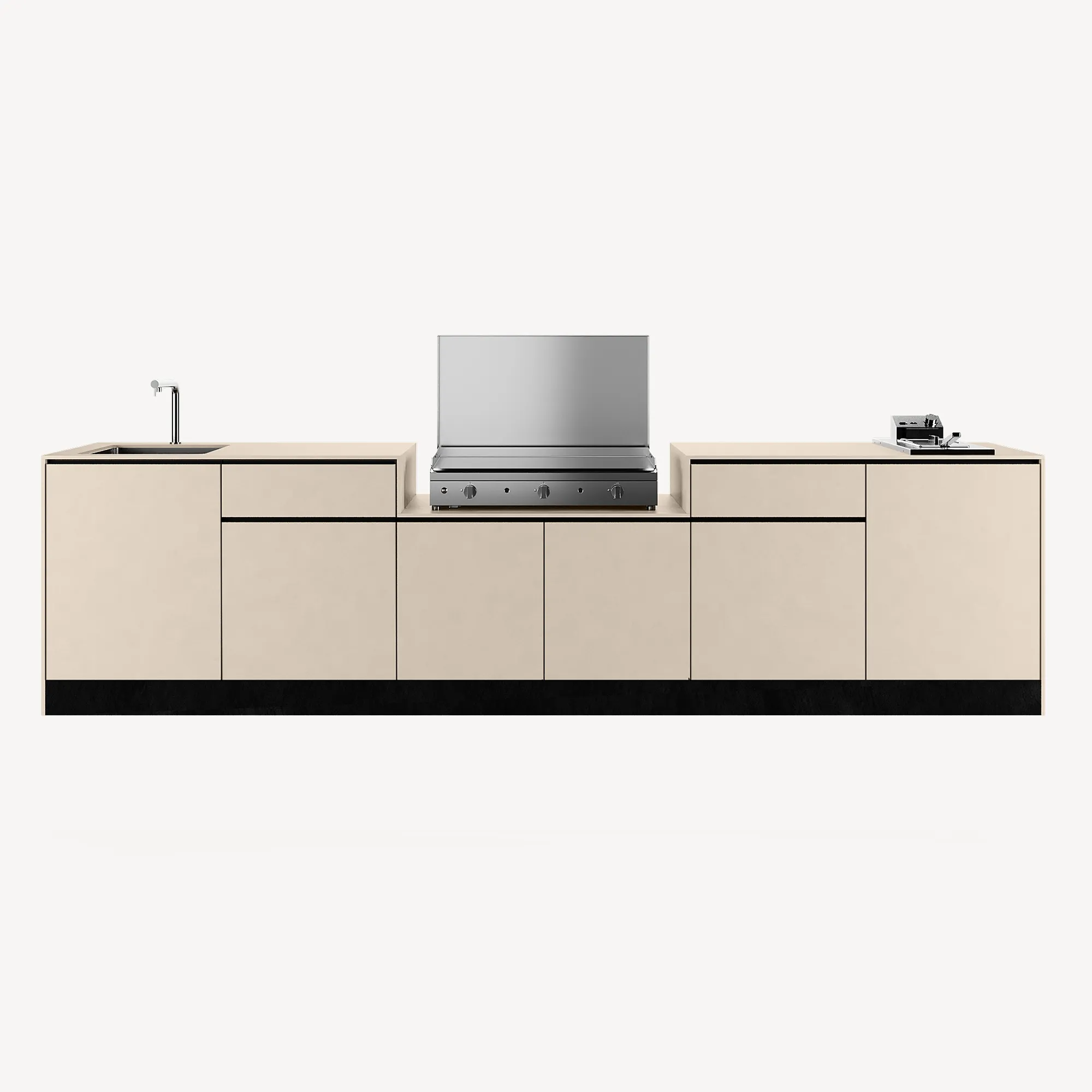 Cuisine d’extérieur de largeur 3430 mm disposant d’un point d’eau, de deux espaces de travail ainsi que deux espaces de cuisson. Dans le détail notre modèlede cuisine d’été BELHARRA est composé d’un élément sous-évier (1 porte) de largeur 600 mm, d’un élement bas (1 porte + 1 tiroir équipé d’un range couvert) de 600 mm, d’un élément surbaissé (2 portes) de largeur 1000 équipé de sa plancha à poser PLANET CHEF80, d’un élement bas (1 porte + 1 tiroir équipé d’un range couvert) de 600 mm, ainsi que d’un élément sous cuisson (1 porte) équipé de sa friteuse éléctrique encastrable PLANET. Vous disposerez deux espaces de travail de 600 mm, un entre point d’eau et cuisson et l’autre entre les deux appareils de cuisson. Cet ensemble dispose d’un grand nombre d’étagères ainsi que de deux tiroirs à couverts. Caissons 100% aluminium certifié Qualimarine®. Étagères verre trempé 8 mm certifiées Templedur®. Quincaillerie Hettich.