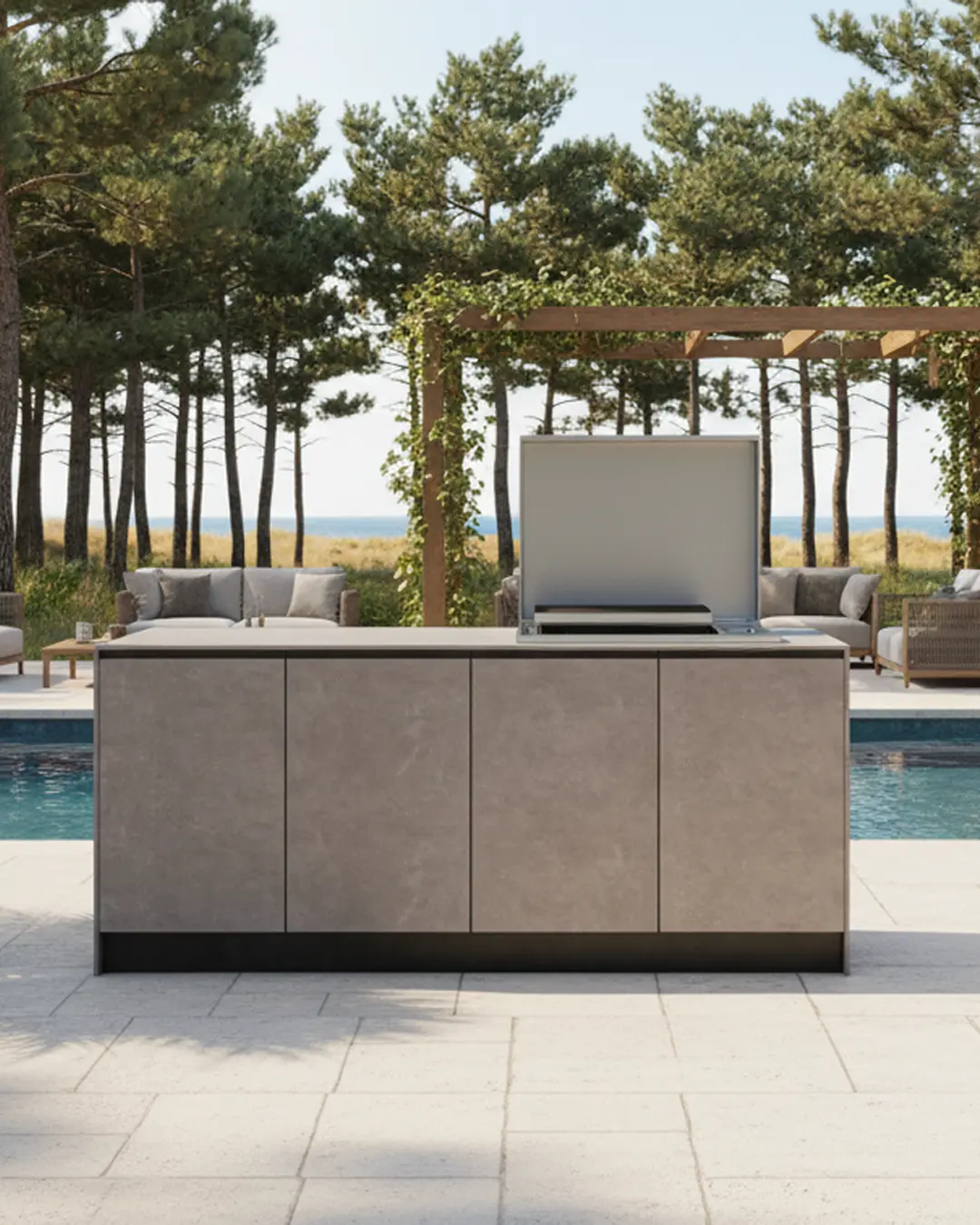 Imaginez une cuisine extérieure en céramique blanche sur une terrasse avec vue sur le Bassin d’Arcachon, idéale pour résister aux embruns. À Caudéran ou au Bouscat, nos meubles premium subliment un jardin paysager. Au Cap Ferret, nos façades et plans de travail en compact texture bois clair s’adaptent parfaitement à l’ambiance bord de mer.