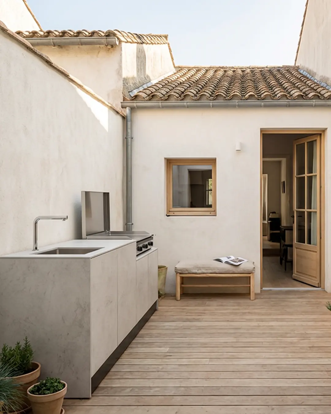 Visualisez une cuisine extérieure en céramique gris clair sur une terrasse vue port, pensée pour supporter les embruns. Dans une maison de La Genette, une cuisine en compact terracotta crée un contraste chaleureux avec le blanc des façades. Vers les Minimes, un modèle moderne accompagne l’ambiance nautique du quartier.