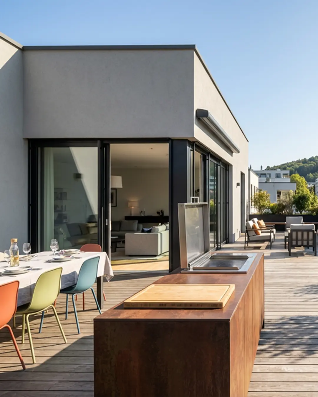 À Lyon, une cuisine extérieure anthracite complète l’élégance d’un toit-terrasse. Dans le Beaujolais, une finition bois clair s’accorde à la douceur des vignes environnantes. À Tassin ou Écully, une cuisine avec façades et plans de travail en céramique minérale accompagne les jardins arborés. Le Rhône inspire des espaces premium, polyvalents et toujours harmonieux.