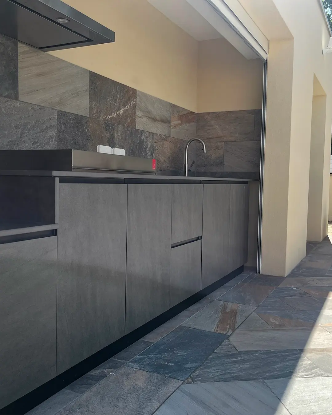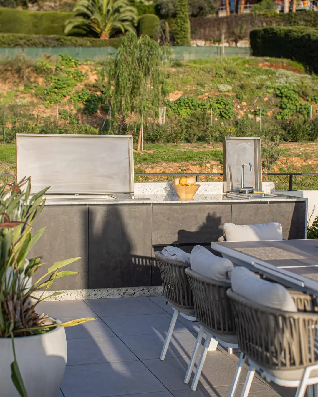 Les meubles en céramique Iron Grey, associés à un plan de travail en granit, offrent une alliance parfaite entre esthétisme et résistance. Ces deux matériaux ont été choisis pour leur capacité à supporter de fortes expositions aux intempéries. Cette cuisine d’extérieur sans toit pourra ainsi conserver son élégance et sa durabilité dans le temps, sans altération.