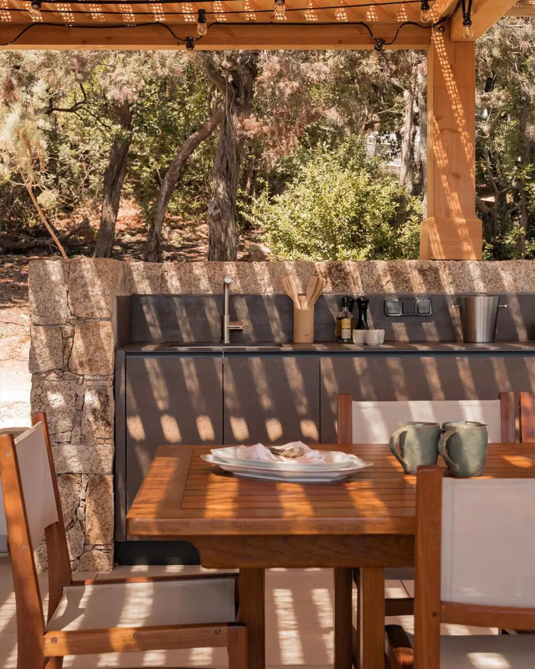 Implantée sous une structure protectrice, la cuisine bénéficie d’un ombrage naturel, typique et chaleureux, essentiel pour profiter de l’extérieur tout au long de la journée et de l’année.