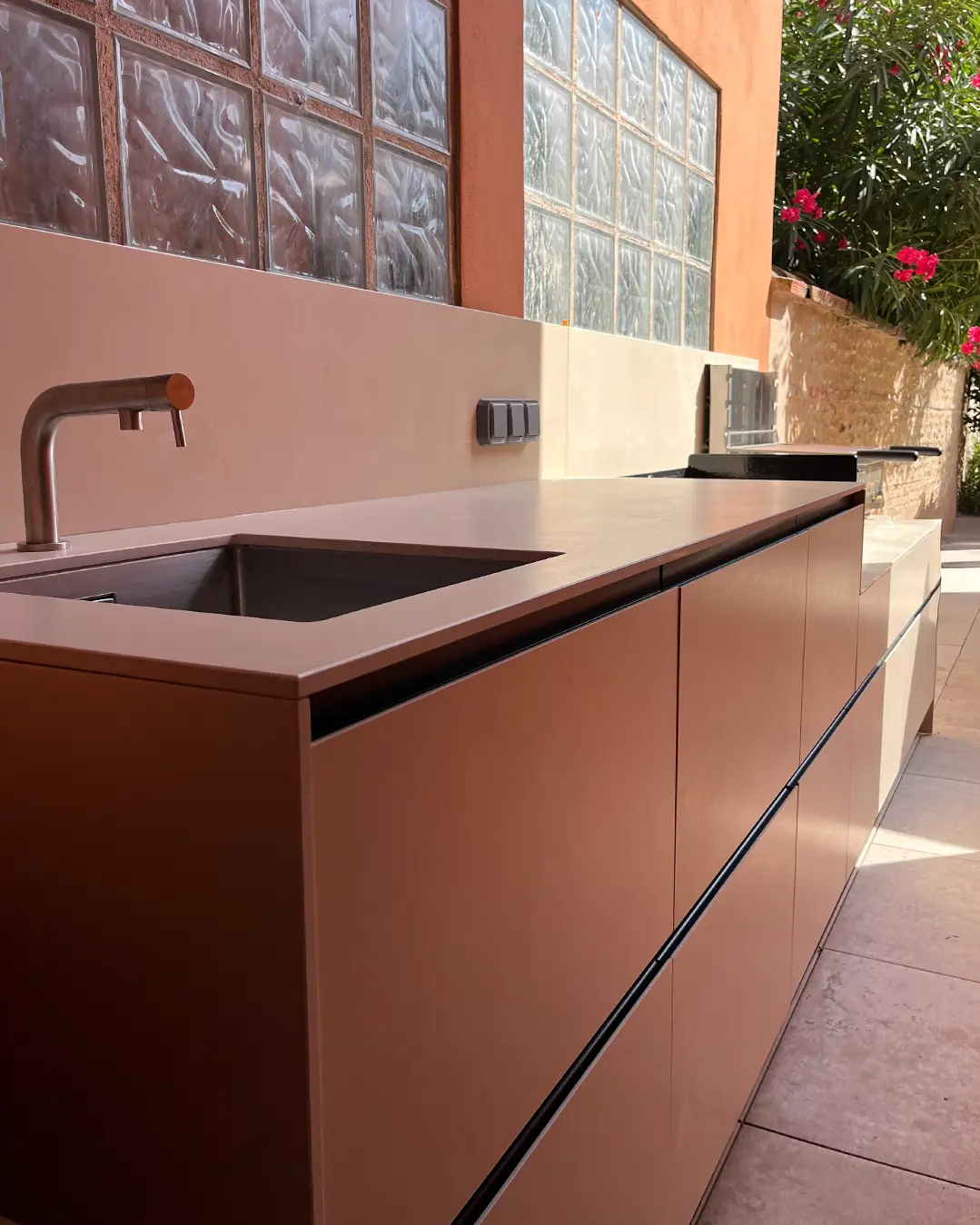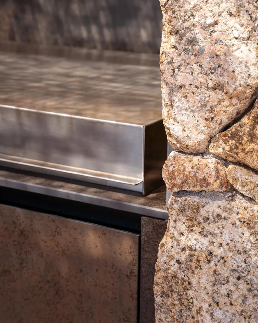 La céramique Iron Corten confère à cette réalisation un caractère puissant et authentique. Son aspect patiné évoque le métal vieilli tout en offrant une résistance exceptionnelle à l’air salin, à la chaleur et aux UV.