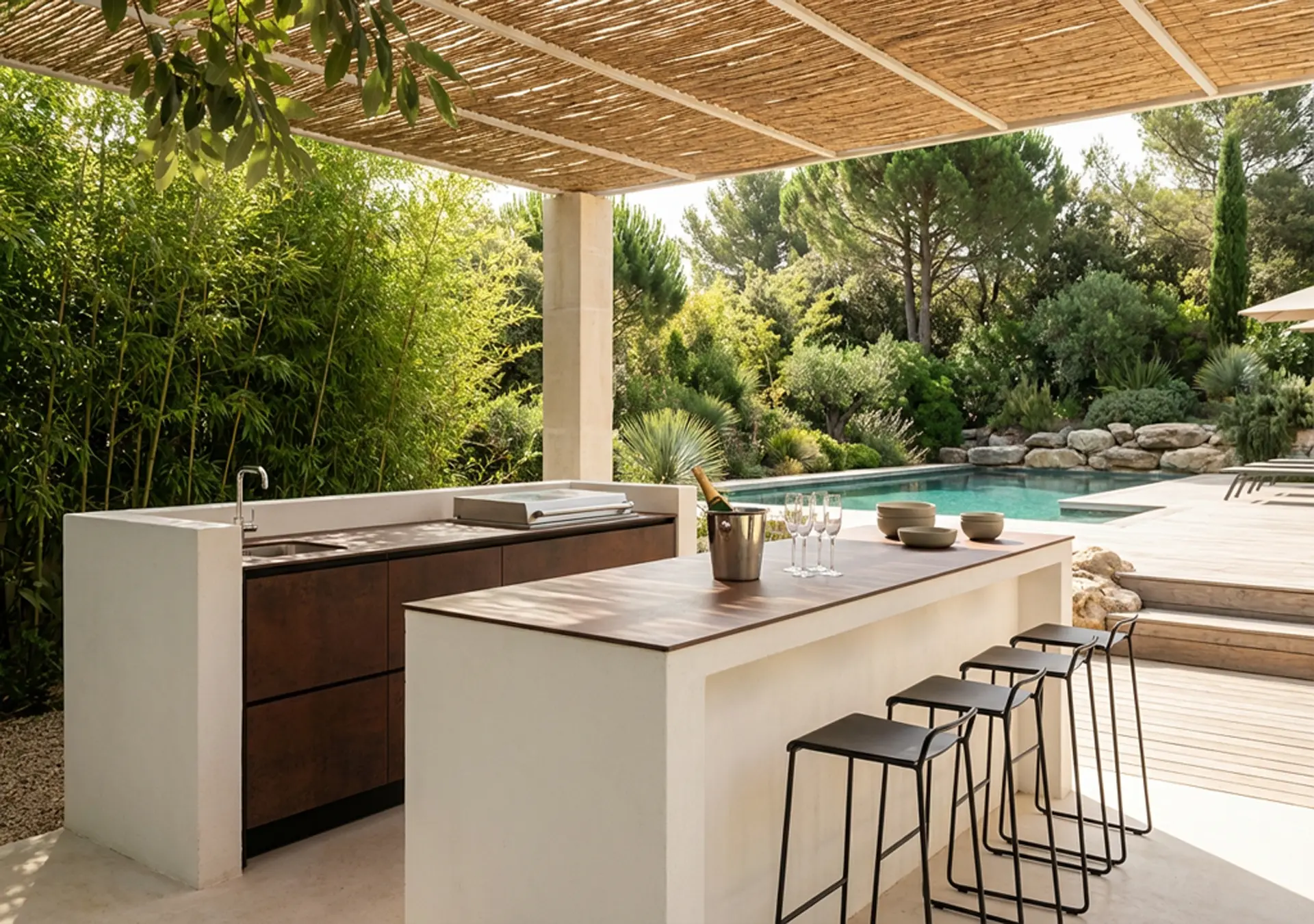 Le bar structure l’espace, donne un rythme, crée une hiérarchie des usages. Il permet d’imaginer des scénarios multiples : petit-déjeuner ensoleillé, apéritif entre amis, repas familial, soirée estivale prolongée. Bien conçu, il accompagne les usages au fil des saisons et des moments de vie.