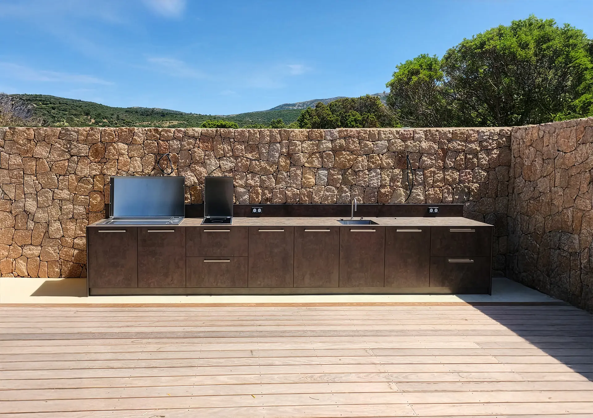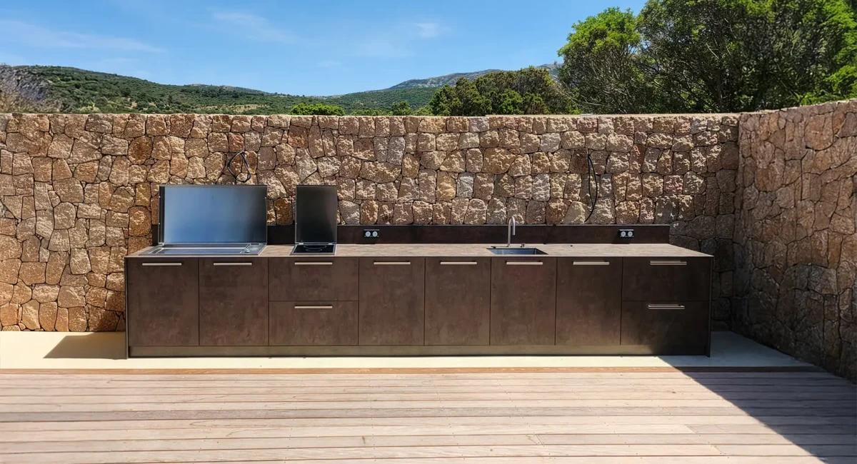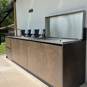 Le choix des matériaux est essentiel pour garantir la durabilité et l’esthétique de votre cuisine extérieure. Chez cuisinedété, nous privilégions deux matériaux haut de gamme spécialement adaptés à un usage en extérieur :